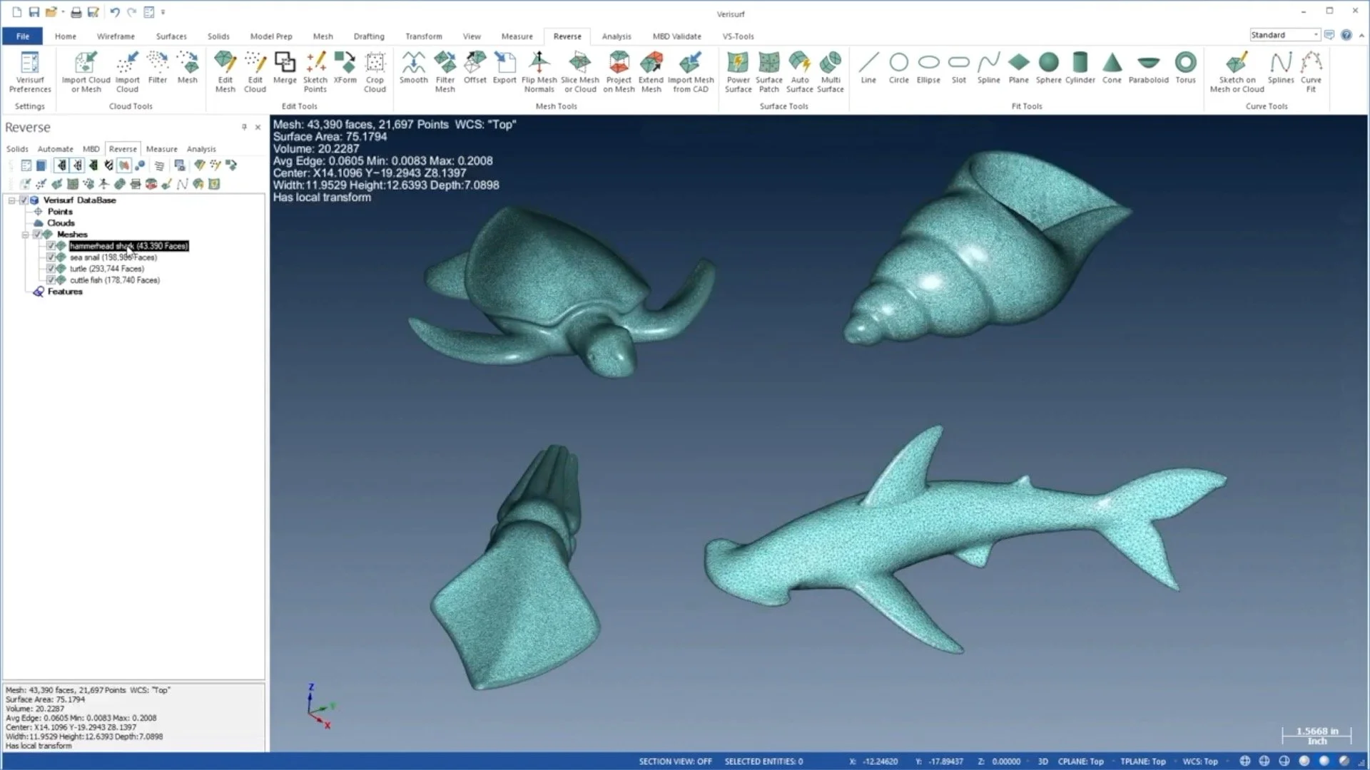 Numerous surfacing tools within reverse engineering software can convert meshes or mesh segments into primitive features such as cylinders, planes, spheres, etc., and also lofted NURBS (non-uniform, rational b-spline) surfaces that define organic, free-flowing shapes. However, it’s important to note that meshing is not the only way to get from scanned data to CAD. Slicing and feature-fitting from point clouds are also possible without the use of meshes. Nevertheless, meshes are frequently used in some stages of the RE process.