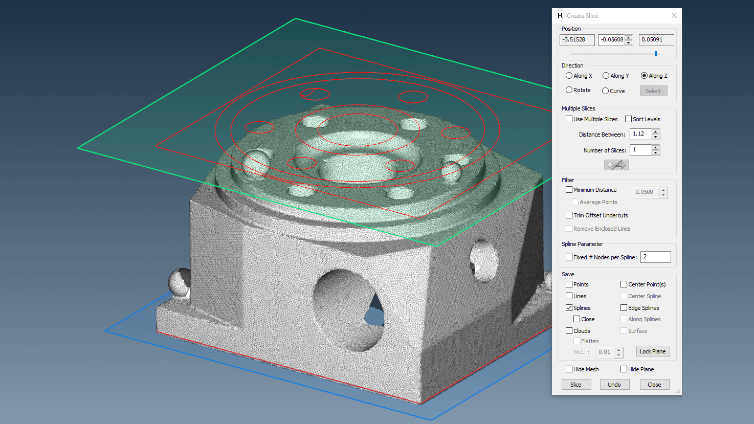 Splines are often created by “slicing” the mesh. Slices can be created where wireframe curves or surface entities cross the mesh at selected CAD planes (XY, YZ, XZ) or constructed planes. Slices may be “lofted” into NURBS (non-rational uniform B-spline) surfaces, and they can be used to trim surfaces to EOP (edge of part).