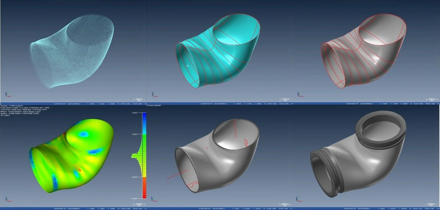 An important aspect of 3D scan to CAD is bringing features on the part together and effectively including transitions between features. Fillet radii and chamfers are good examples of such transitions, but they can take many forms. Reverse engineering software will have advanced hybrid tools and techniques plus special surfacing tools that utilize the mesh. Most RE software have greater mesh tools than CAD software. That said, CAD software usually has more ability to mirror, offset, revolve, copy, translate, rotate, etc., which are tremendously useful, time-saving tools in the process. All of this makes a good argument for software that combines powerful CAD and measurement metrology, reverse engineering software all in one.