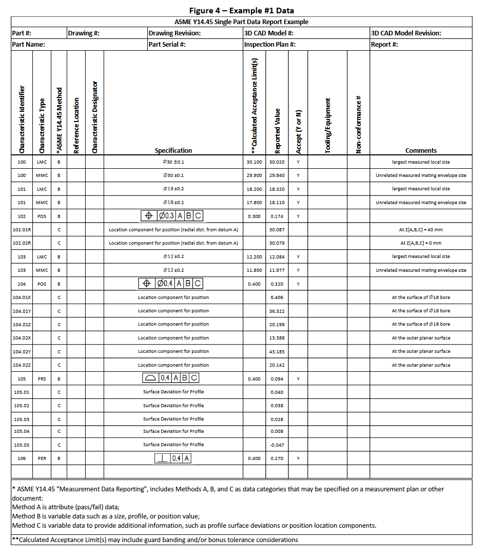 The AS9201B First Article Inspection form was used as the starting point for the report format used in Y14.45, with revisions made to better suit the needs of data to address GD&T specifications. Please review the columns provided in the data report format shown in Figure 1 before continuing.