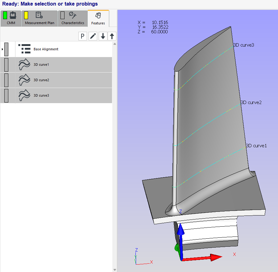 The alignment from several curves establishes a coordinate system by using a series of measured points on multiple curves. In this example we will use a turbine blade. This process involves: