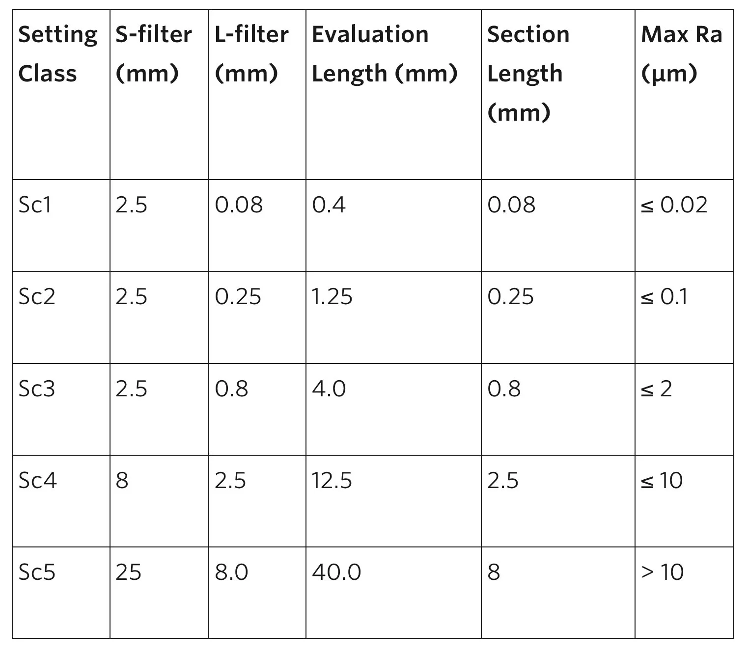 To implement this in practice, ISO 21920 introduces five Setting Classes (Sc1 through Sc5), each with preset parameters for filter types, section lengths, number of sections, and evaluation length. The table below shows the corresponding parameters for each of the setting classes. The last column shows the cutoff value for Ra for each setting class. There are many other cutoff values for surface parameters including Rq, Rz, Rp, Rv, Rzx, and Rt.