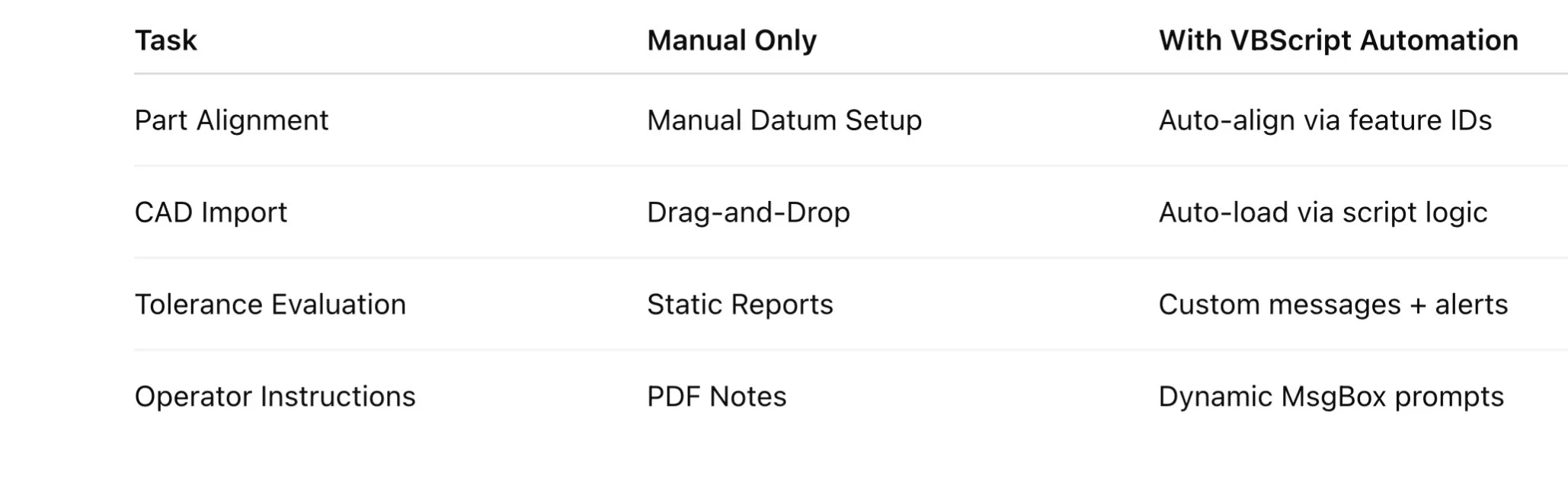 VBScript transforms CMM Manager from a point-and-click tool into a powerful metrology automation platform — with logic, intelligence, and control built in.
